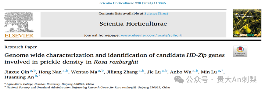 Sci Hortic |贵州大学安华明教授课题组在刺梨皮刺密度分子调控方面提供了新见解发表时间:2024-07-14 16:10 刺梨是贵州省重点发展特色产业,其果实含丰富营养物质,有极高的保健价值和医药价值。但刺梨枝干、果实上密被皮刺,为鲜食及田间管理带来障碍。HD-Zip基因家族在毛状体的形成和发育中发挥重要作用,然而,目前尚未有对刺梨HD-Zip基因家族的系统鉴定和刺密度相关基因的筛选分析。 近期,贵州大学安华明教授课题组在《Scientia Horticulturae》在线发表了题为“Genome wide characterization and identification of candidate HD-Zip genes involved in prickle density in Rosa roxburghii”的研究论文。