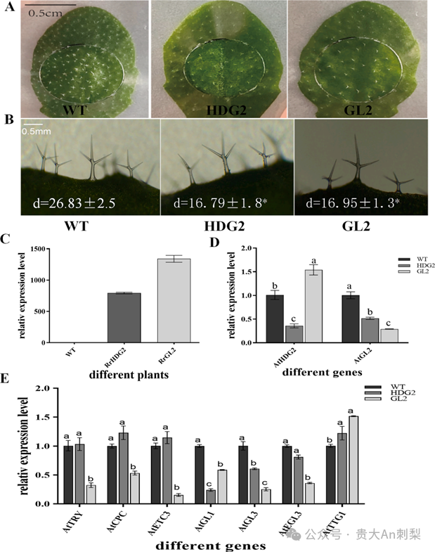 该研究首先对刺梨HD-Zip基因家族进行了成员鉴定,并对其进行了生物信息学分析,发现刺梨中有38条HD-Zip家族成员并将其分为4个亚科(HD-Zip I~HD-Zip IV)。通过转录组数据和表达分析发现RrHD-Zip IV家族成员RrGL2和RrHDG2基因在有刺缺失或少量存在的器官中表达较高(如叶肉、花瓣和突变的少刺花梗),这种表达模式总伴随着RrGL1表达的减少。在拟南芥中进行过表达RrGL2后,转基因植株表皮毛密度降低,同时AtGL1的表达下调。 此外,文章还发现了果柄少刺突变体,可作为进一步研究木本植物刺的优良材料。这些发现阐明了RrHD-Zip基因的进化和表达模式,为了解刺梨毛状体密度的调控机制提供了有价值的参考,并为未来RrHD-Zip基因的功能鉴定奠定了基础。